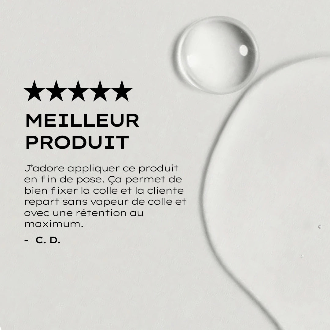 Un scellant pour cils innovant (doté de notre formule mise à jour et approuvée, en vigueur depuis avril 2024) qui fonctionne universellement avec N'IMPORTE QUELLE colle pour extensions de cils. Il polymérise instantanément la colle et ajoute une flexibilité essentielle au point de fixation, garantissant que les extensions ne se cassent pas ou ne se détachent pas facilement lorsque les cils naturels de la cliente bougent.